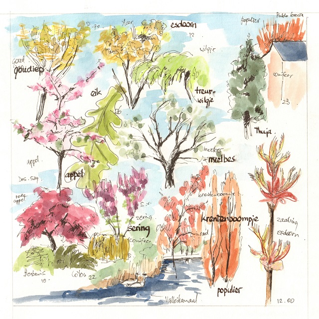 Ik stap van mijn fiets bij iedere boom die er mooi uitziet en niet te dichtbij staat. Dat is belangrijk omdat het anders veel te gedetailleerd en te groot wordt. Ik schets hem en schrijf de kleuren en de naam erbij. Het zijn bomen die ik jaren geleden ook eens getekend heb, maar dat was in de herfst en toen ging het om de individuele herfstkleuren van elke boom. Ach, elke dag is mooi.