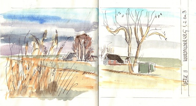 Fietsend over de Oudendijk had ik dit uitzicht. Deze huisjes staan langs de weg naar Noordpolderzijl en ze staan zo dicht langs de weg dat ik daar nooit zou kunnen tekenen. Maar van hieruit heb je een prachtig uitzicht op alle drie. Dus deze keer drie tegelijk.