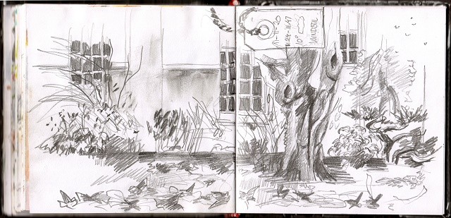 Soms ga ik uit van wat ik zie en kies dan het materiaal, maar vandaag heb ik eerst het materiaal gekozen. Ik werk met een zwart aquasketch potlood, om precies te zijn ‘Karisma Graphic Aquarelle soft’. Het is een klein oudje, ik weet niet of ze nog te koop zijn. Het heeft een grijze gloed, maar ook een heel zwart lijntje als je het potlood scherp slijpt. En wateroplosbaar. Wow.