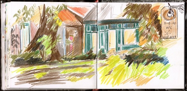 Ik zit op mijn gele stoeltje lekker onderuit en kleur van licht naar donker. In de schaduw van de stam zie ik de kleuren van mijn potloden niet goed en grijp ik soms mis naar bruin, paars en donkerblauw.