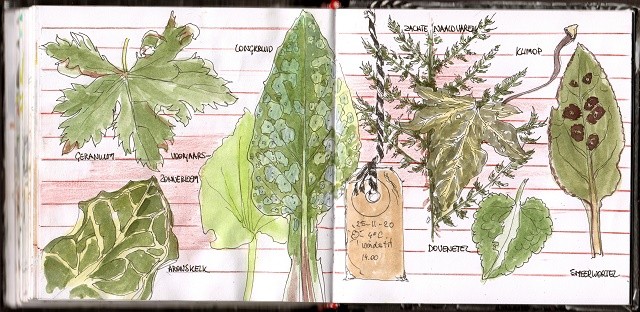 Dus het werden bladeren. Maar dan wel in mijn warme atelier. En hoewel ik de bladeren zelf in de koude schuur bewaarde, moest ik nog opschieten omdat ze verleppen waar je bij zit. Wat wil je, met zo’n warme tekenlamp. Dan zou ik ook opkrullen. En Siep ook.