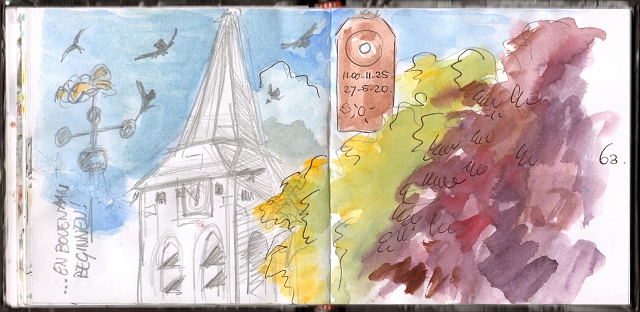 De tuin staat vol, de bomen ziten in het blad en de kastanje is uitgebloeid. Dus gaat de blik vanzelf naar boven, naar de kerktoren, maar vooral naar de kauwen die er omheen cirkelen. Hoe teken je kauwen? Het antwoord is: uit je hoofd. Kijk naar het silhouet van één beweging, probeer het te onthouden en teken alleen dat wat je hebt onthouden. Niet meer. Geen snavels toevoegen die je niet gezien hebt. Geen staart als je hem niet gezien hebt. En dat gebeurt zomaar juist wèl, effe nog een krabbeltje, vooral omdat het gedachteloos gaat.