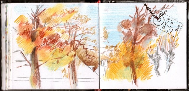 Zoek een gekleurde boom in de verte, kijk goed naar de kleurvlakken en krabbel uit je hoofd de kleurvlekken arcerend in de vorm van de boom. Bij een berk verticaal naar beneden, bij een populier warrig in een pluk bovenaan de boom. Dat is het. Voeg later takken en stam toe, en schets vanuit de kleur, van boven naar beneden. Gewoon een keer proberen, het is leuk om te doen als je het maar klein houdt: iets van 3 cm per boom.