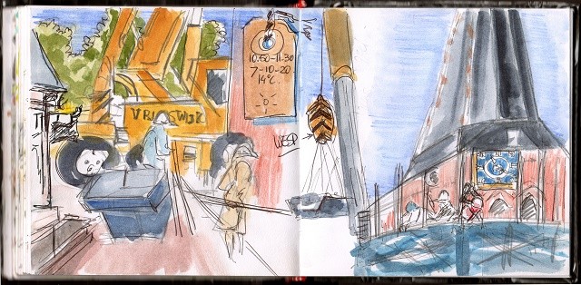 Ik begon meteen te tekenen, zittend op het trapje van de kerktuin. Toen ik de linkerbladzijde had gedaan, ben ik net zo lang omgelopen tot ik de bovenkant van de toren goed in zicht had, en niet tegen de zon in. De mannen boven op de steigers zwaaiden naar me en ik beduidde dat ik ze aan het tekenen was, maar dat hadden ze allang gezien. Gezellige boel daarboven.