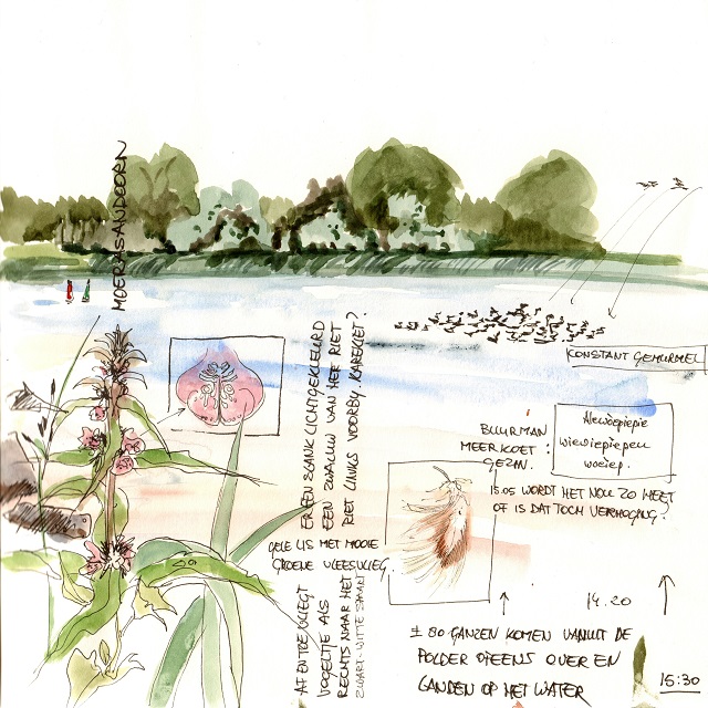 Ik heb me voorbereid door boeken over natuurschetsboeken te herlezen. De meeste boeken over journaling zijn Amerikaans en omdat het daar als kunstvorm wordt beschouwd zijn er veel voorbeelden in te zien van bladindeling en verhouding tussen tekst en tekeningen. Een paar kunstenaars, bijvoorbeeld Gay Kraeger (die mijn werk mooi vindt) en Cathy Johnson, maken de mooiste bladzijden die ik uitgebreid bestudeerd heb. Wat doen zij met hun teksten, waar laten ze de datum, schrijven ze ter plekke of thuis? Sommigen schrijven door hun tekeningen heen, anderen maken kleine kaders.