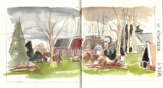 Maar ik sprong met een schok van mijn fiets af. Aan de rechterkant van dit prachtige plaatje zijn alle bomen gekapt. Afschuwelijk. Echt heel erg afschuwelijk. Een snijdend en draaiend gevoel begon in mijn keel en sneed daarna door naar beneden om in mijn maag een aantal keren rond te draaien. Ik werd er zelfs letterlijk duizelig van. Ik maakte een foto en – wat ik anders nooit doe – ik maak daar vandaag een schets van, veilig aan tafel.